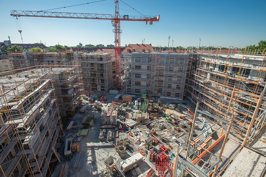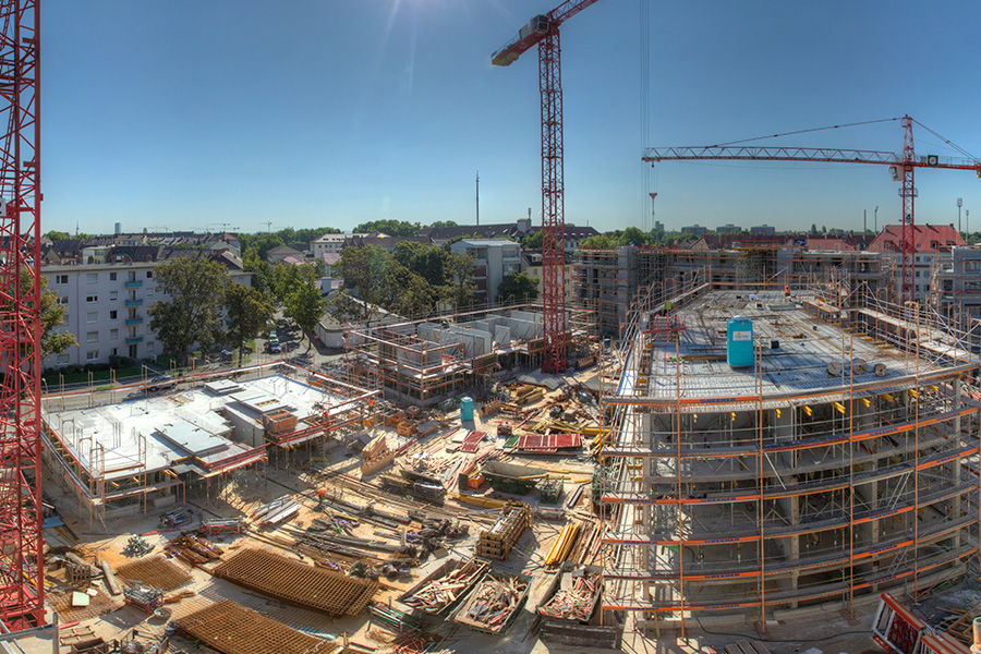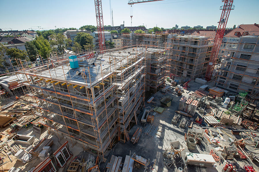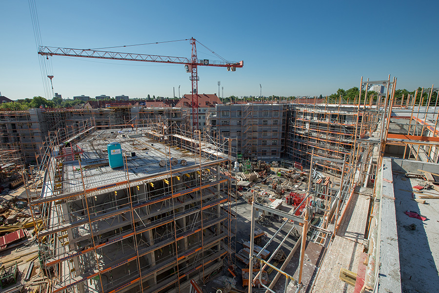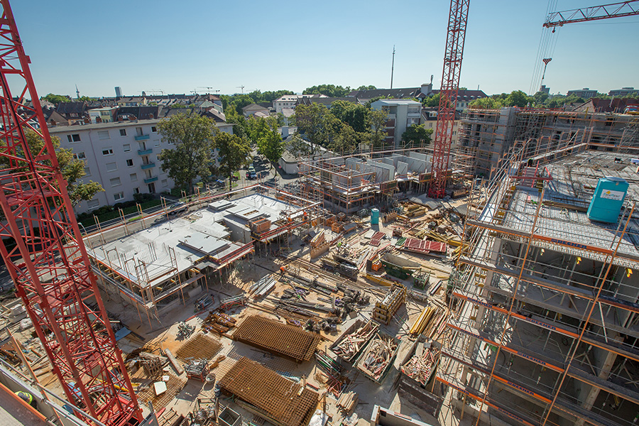 Zusätzlich stellte die innerstädtische Lage mit sehr beengten Platzverhältnissen hohe Anforderungen an Planung und Bauablauf. Der Verbau erfolgte unmittelbar an mehreren Hauptverkehrsstraßen. Die Fundamente der Baukräne wurden in die Bodenplatte der Tiefgarage integriert, sodass die Gebäude abschnittsweise um die Kräne herum errichtet werden konnten. Nach Abschluss der Rohbauarbeiten wurden die Kräne zurückgebaut und die hierfür vorgesehenen Öffnungen in der Bauwerksmitte statisch nachträglich geschlossen.