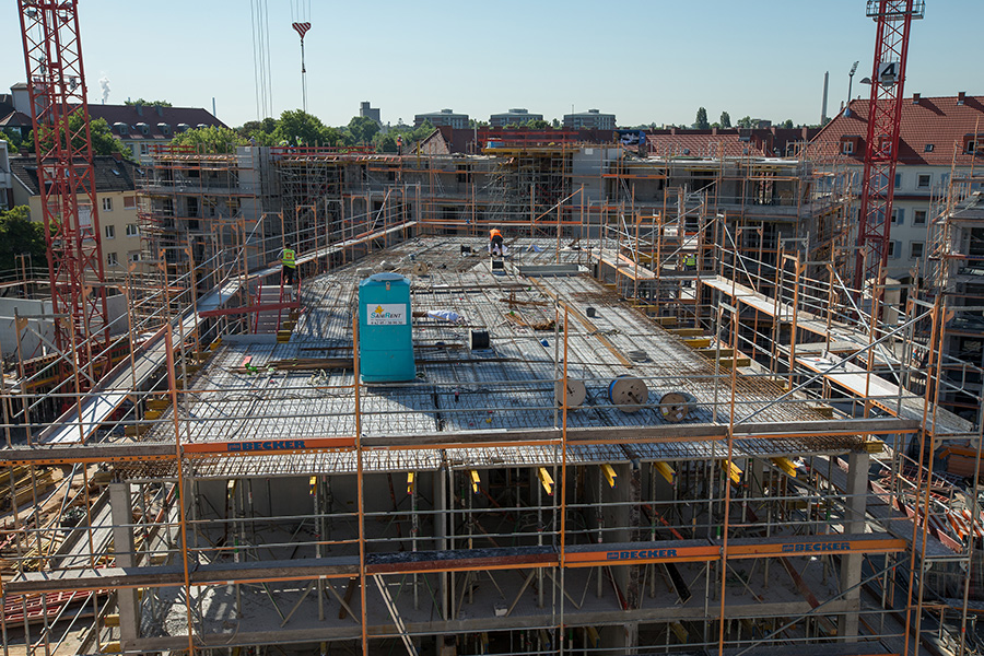 Eine zentrale konstruktive Herausforderung stellte die Ausbildung der Tiefgaragendecke als Flachdecke dar. Die Lasten der aufstehenden Gebäude mussten teilweise über wandartige Träger innerhalb der aufgehenden Wände abgetragen werden. In besonders hoch beanspruchten Bereichen waren zudem komplexe konstruktive Maßnahmen zur Aufnahme der Durchstanzlasten erforderlich. Die polygonale Grundstücksform bedingte darüber hinaus eine anspruchsvolle, radiale Bewehrungsführung, die eine hohe planerische Präzision erforderte.